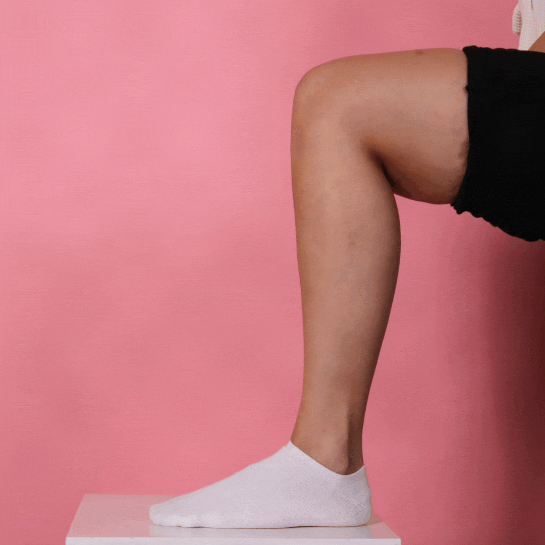 • Calves can be easily worked by lifting the leg onto your lap or standing, squatting slightly and leaning back.